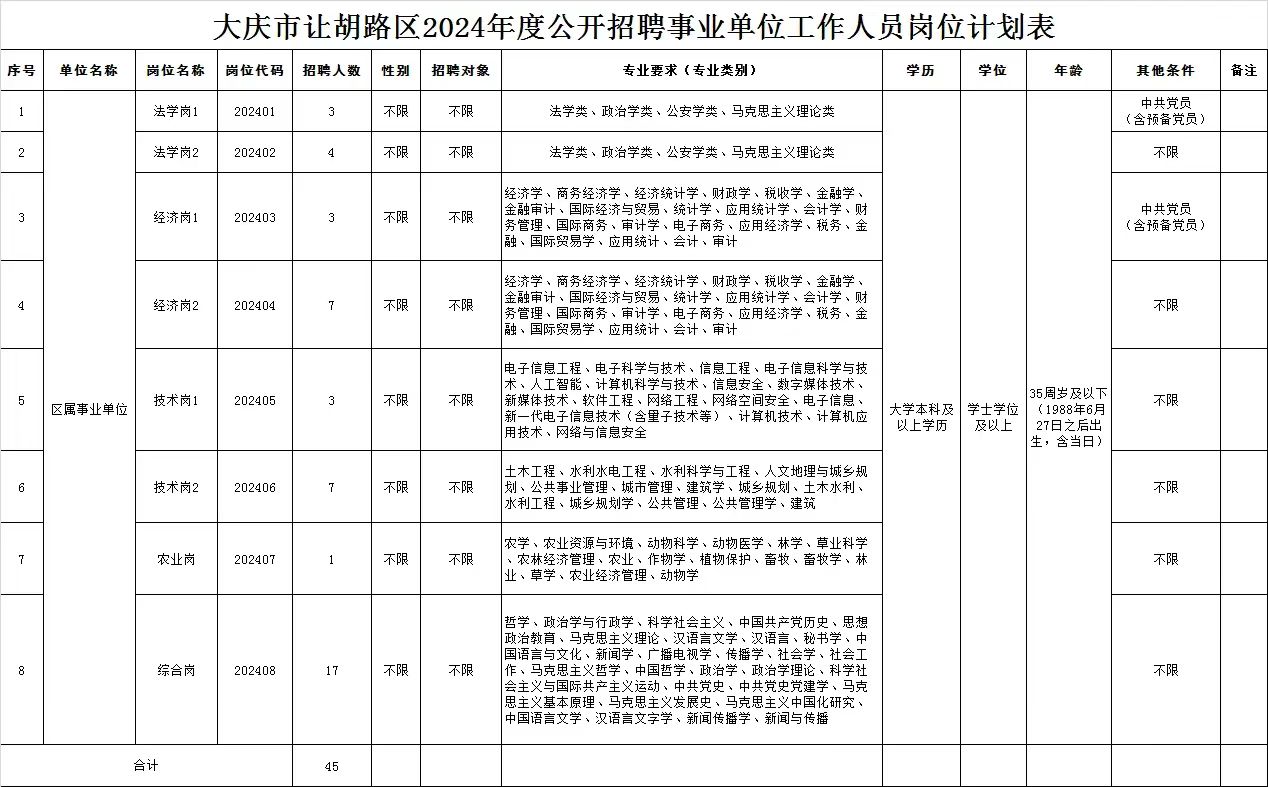 計劃招聘45人。具體詳見《大慶市讓胡路區(qū)2024年度公開招聘事業(yè)單位工作人員崗位計劃表》(附件1)。