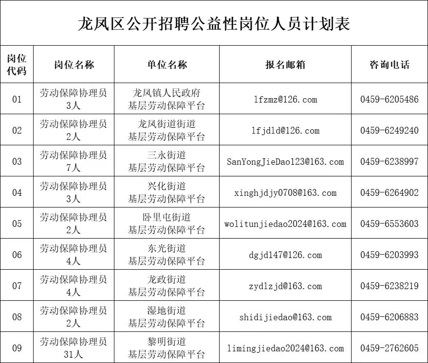 龍鳳區(qū)公益性崗位招聘公告根據(jù)工作需要,擬招聘公益性崗位工作人員58人,現(xiàn)將有關(guān)事宜公告如下: