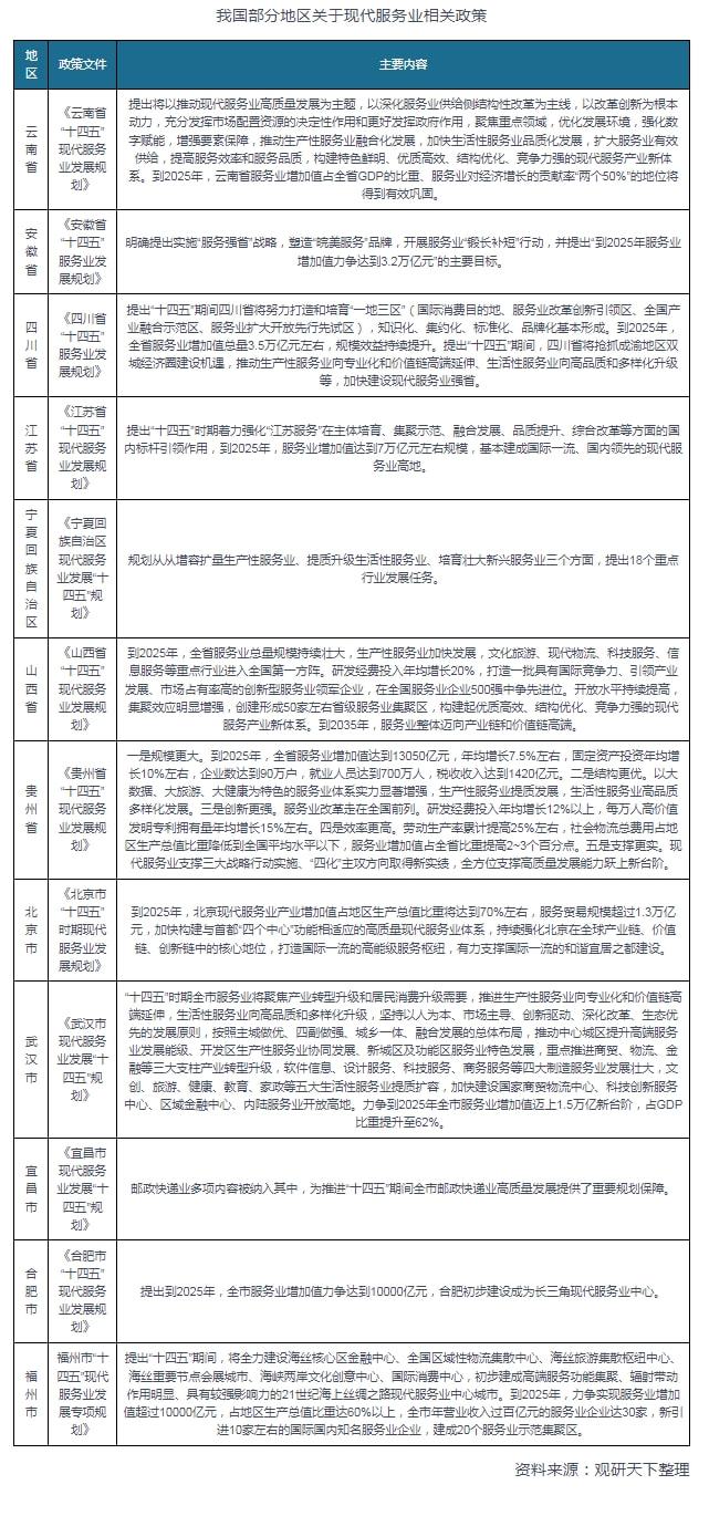 近年來國家及地區不斷重視現代服務業的發展。例如2020年11月,中國政府網發布的《中共中央關于制定國民經濟和社會發展第十四個五年規劃和二〇三五年遠景目標的建議》,明確提出加快發展現代服務業。推動生產性服務業向專業化和價值鏈高端延伸,推動各類市場主體參與服務供給,加快發展研發設計、現代物流、法律服務等服務業,推動現代服務業同先進制造業、現代農業深度融合,加快推進服務業數字化。
